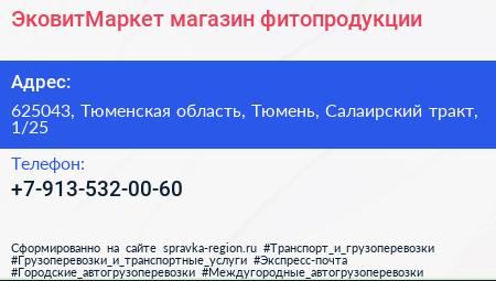 ЭковитМаркет, магазин фитопродукции по адресу 625043, Тюменская область, Тюмень, Салаирский тракт, 1/25 в дальнейшем Организация, размещена в следующих категориях: