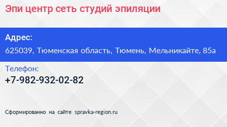 Эпи-центр, сеть студий эпиляции по адресу 625039, Тюменская область, Тюмень, Мельникайте, 85а в дальнейшем Организация, размещена в следующих категориях: