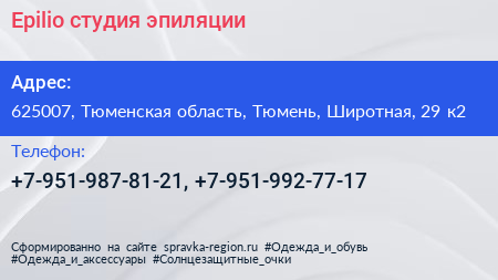 Epilio, студия эпиляции по адресу 625007, Тюменская область, Тюмень, Широтная, 29 к2 в дальнейшем Организация, размещена в следующих категориях: