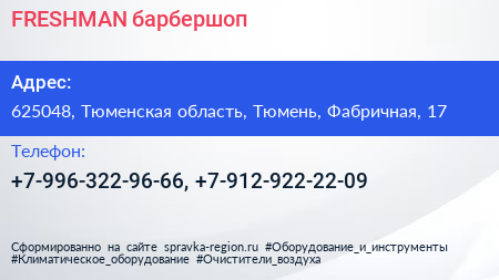 FRESHMAN, барбершоп по адресу 625048, Тюменская область, Тюмень, Фабричная, 17 в дальнейшем Организация, размещена в следующих категориях: