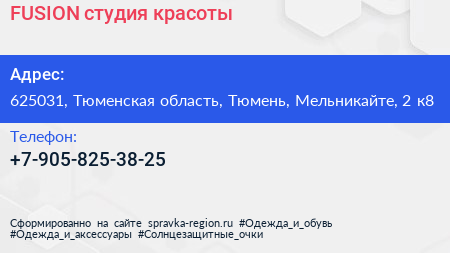 FUSION, студия красоты по адресу 625031, Тюменская область, Тюмень, Мельникайте, 2 к8 в дальнейшем Организация, размещена в следующих категориях: