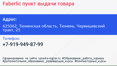 Faberlic, пункт выдачи товара по адресу 625062, Тюменская область, Тюмень, Червишевский тракт, 25 в дальнейшем Организация, размещена в следующих категориях:
