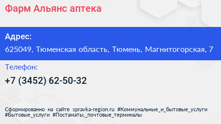 Фарм-Альянс, аптека по адресу 625049, Тюменская область, Тюмень, Магнитогорская, 7 в дальнейшем Организация, размещена в следующих категориях: