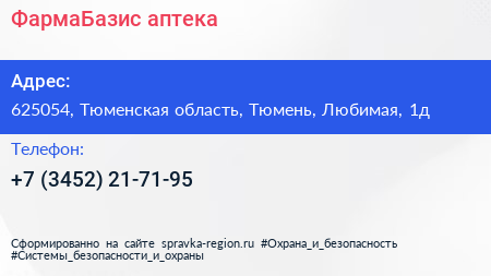ФармаБазис, аптека по адресу 625054, Тюменская область, Тюмень, Любимая, 1д в дальнейшем Организация, размещена в следующих категориях: