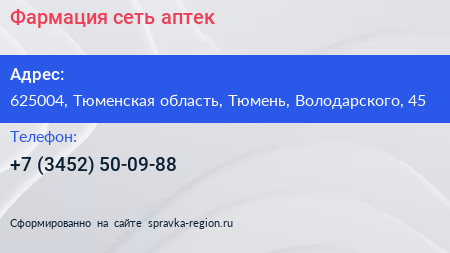 Фармация, сеть аптек по адресу 625004, Тюменская область, Тюмень, Володарского, 45 в дальнейшем Организация, размещена в следующих категориях: