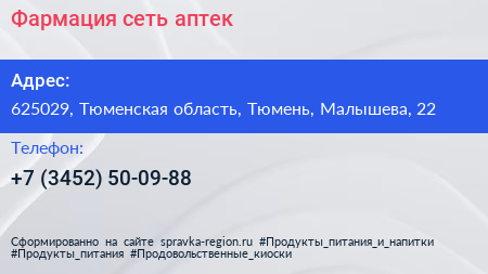 Фармация, сеть аптек по адресу 625029, Тюменская область, Тюмень, Малышева, 22 в дальнейшем Организация, размещена в следующих категориях: