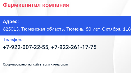 Фармкапитал, компания по адресу 625013, Тюменская область, Тюмень, 50 лет Октября, 118 в дальнейшем Организация, размещена в следующих категориях: