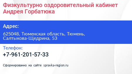 Физкультурно-оздоровительный кабинет Андрея Горбатюка по адресу 625048, Тюменская область, Тюмень, Салтыкова-Щедрина, 53 в дальнейшем Организация, размещена в следующих категориях: