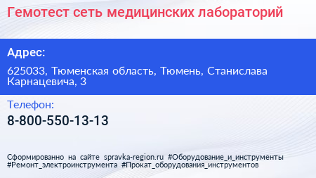 Гемотест, сеть медицинских лабораторий по адресу 625033, Тюменская область, Тюмень, Станислава Карнацевича, 3 в дальнейшем Организация, размещена в следующих категориях: