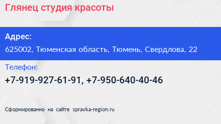 Глянец, студия красоты по адресу 625002, Тюменская область, Тюмень, Свердлова, 22 в дальнейшем Организация, размещена в следующих категориях: