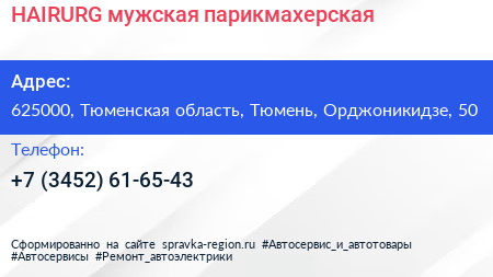 HAIRURG, мужская парикмахерская по адресу 625000, Тюменская область, Тюмень, Орджоникидзе, 50 в дальнейшем Организация, размещена в следующих категориях: