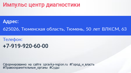Импульс, центр диагностики по адресу 625026, Тюменская область, Тюмень, 50 лет ВЛКСМ, 63 в дальнейшем Организация, размещена в следующих категориях: