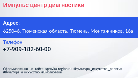 Импульс, центр диагностики по адресу 625046, Тюменская область, Тюмень, Монтажников, 16а в дальнейшем Организация, размещена в следующих категориях: