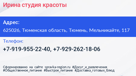 Ирина, студия красоты по адресу 625026, Тюменская область, Тюмень, Мельникайте, 117 в дальнейшем Организация, размещена в следующих категориях:
