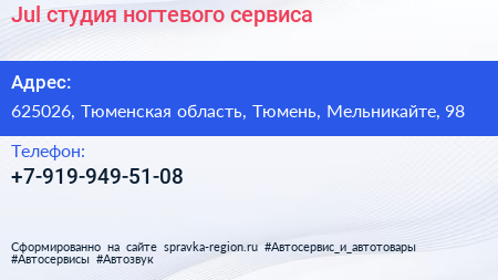 Jul, студия ногтевого сервиса по адресу 625026, Тюменская область, Тюмень, Мельникайте, 98 в дальнейшем Организация, размещена в следующих категориях: