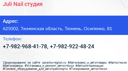 Juli Nail, студия по адресу 625002, Тюменская область, Тюмень, Осипенко, 81 в дальнейшем Организация, размещена в следующих категориях: