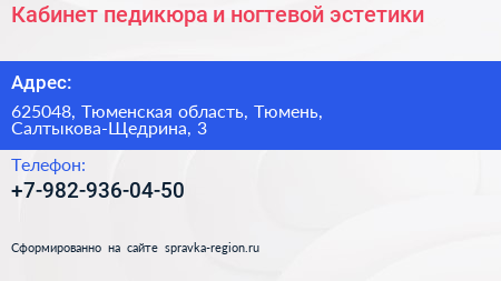 Кабинет педикюра и ногтевой эстетики по адресу 625048, Тюменская область, Тюмень, Салтыкова-Щедрина, 3 в дальнейшем Организация, размещена в следующих категориях: