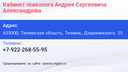 Кабинет психолога Андрея Сергеевича Александрова по адресу 625000, Тюменская область, Тюмень, Дзержинского, 15 в дальнейшем Организация, размещена в следующих категориях: