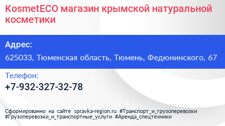 KosmetECO, магазин крымской натуральной косметики по адресу 625033, Тюменская область, Тюмень, Федюнинского, 67 в дальнейшем Организация, размещена в следующих категориях: