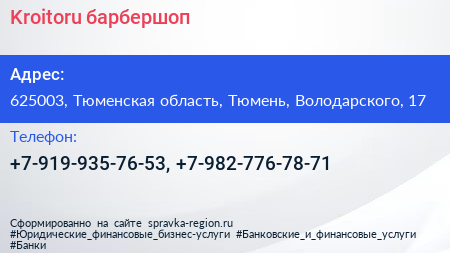 Kroitoru, барбершоп по адресу 625003, Тюменская область, Тюмень, Володарского, 17 в дальнейшем Организация, размещена в следующих категориях: