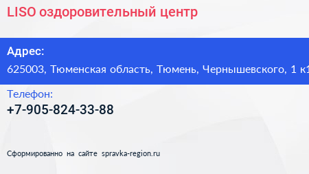 LISO, оздоровительный центр по адресу 625003, Тюменская область, Тюмень, Чернышевского, 1 к1 в дальнейшем Организация, размещена в следующих категориях: