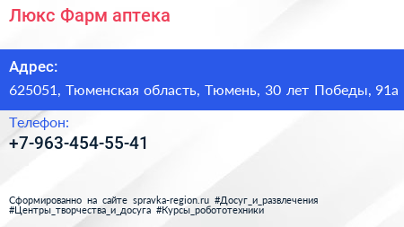Люкс Фарм, аптека по адресу 625051, Тюменская область, Тюмень, 30 лет Победы, 91а в дальнейшем Организация, размещена в следующих категориях: