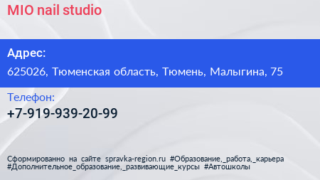 MIO nail studio по адресу 625026, Тюменская область, Тюмень, Малыгина, 75 в дальнейшем Организация, размещена в следующих категориях: