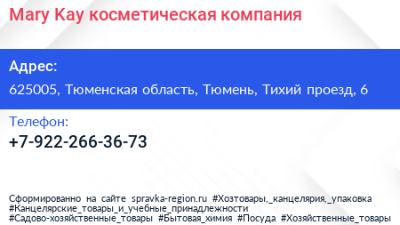 Mary Kay, косметическая компания по адресу 625005, Тюменская область, Тюмень, Тихий проезд, 6 в дальнейшем Организация, размещена в следующих категориях:
