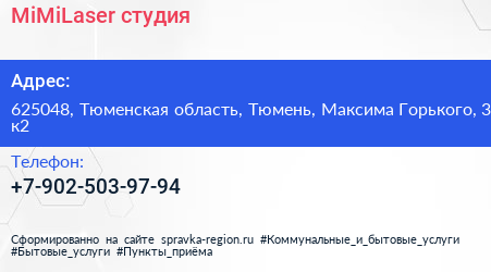 MiMiLaser, студия по адресу 625048, Тюменская область, Тюмень, Максима Горького, 3 к2 в дальнейшем Организация, размещена в следующих категориях: