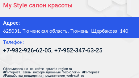 My Style, салон красоты по адресу 625031, Тюменская область, Тюмень, Щербакова, 140 в дальнейшем Организация, размещена в следующих категориях: