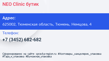 NEO-Clinic, бутик по адресу 625002, Тюменская область, Тюмень, Немцова, 4 в дальнейшем Организация, размещена в следующих категориях: