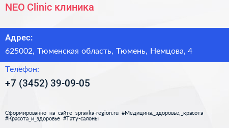 NEO-Clinic, клиника по адресу 625002, Тюменская область, Тюмень, Немцова, 4 в дальнейшем Организация, размещена в следующих категориях: