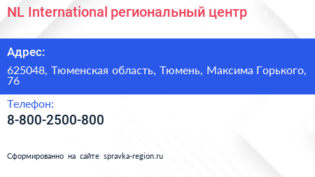 NL International, региональный центр по адресу 625048, Тюменская область, Тюмень, Максима Горького, 76 в дальнейшем Организация, размещена в следующих категориях: