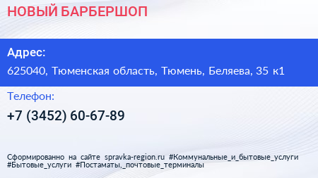 НОВЫЙ БАРБЕРШОП по адресу 625040, Тюменская область, Тюмень, Беляева, 35 к1 в дальнейшем Организация, размещена в следующих категориях: