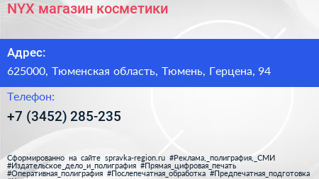 NYX, магазин косметики по адресу 625000, Тюменская область, Тюмень, Герцена, 94 в дальнейшем Организация, размещена в следующих категориях: