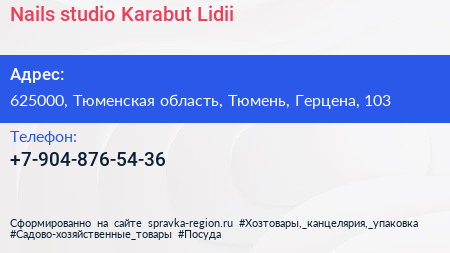 Nails studio Karabut Lidii по адресу 625000, Тюменская область, Тюмень, Герцена, 103 в дальнейшем Организация, размещена в следующих категориях: