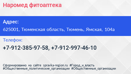 Наромед, фитоаптека по адресу 625001, Тюменская область, Тюмень, Ямская, 104а в дальнейшем Организация, размещена в следующих категориях: