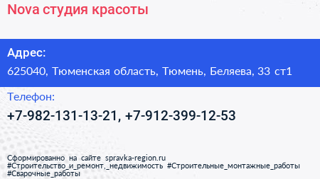 Nova, студия красоты по адресу 625040, Тюменская область, Тюмень, Беляева, 33 ст1 в дальнейшем Организация, размещена в следующих категориях: