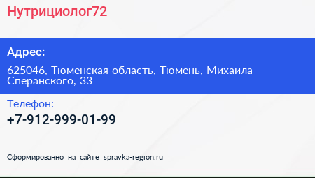 Нутрициолог72 по адресу 625046, Тюменская область, Тюмень, Михаила Сперанского, 33 в дальнейшем Организация, размещена в следующих категориях: