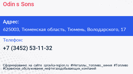 Odin`s Sons по адресу 625003, Тюменская область, Тюмень, Володарского, 17 в дальнейшем Организация, размещена в следующих категориях: