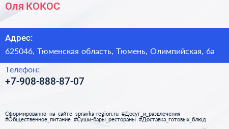 Оля КОКОС по адресу 625046, Тюменская область, Тюмень, Олимпийская, 6а в дальнейшем Организация, размещена в следующих категориях: