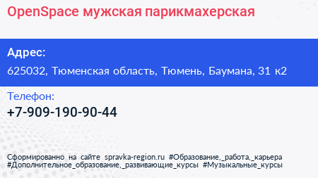 OpenSpace, мужская парикмахерская по адресу 625032, Тюменская область, Тюмень, Баумана, 31 к2 в дальнейшем Организация, размещена в следующих категориях: