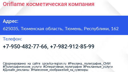 Oriflame, косметическая компания по адресу 625035, Тюменская область, Тюмень, Республики, 162 в дальнейшем Организация, размещена в следующих категориях: