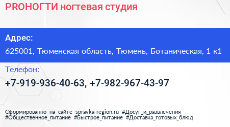 PROНОГТИ, ногтевая студия по адресу 625001, Тюменская область, Тюмень, Ботаническая, 1 к1 в дальнейшем Организация, размещена в следующих категориях: