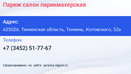 Париж, салон-парикмахерская по адресу 625026, Тюменская область, Тюмень, Котовского, 52а в дальнейшем Организация, размещена в следующих категориях: