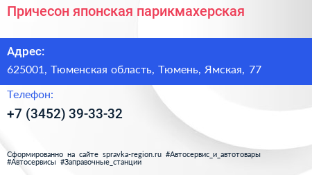 Причесон, японская парикмахерская по адресу 625001, Тюменская область, Тюмень, Ямская, 77 в дальнейшем Организация, размещена в следующих категориях: