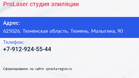 ProLaser, студия эпиляции по адресу 625026, Тюменская область, Тюмень, Малыгина, 90 в дальнейшем Организация, размещена в следующих категориях: