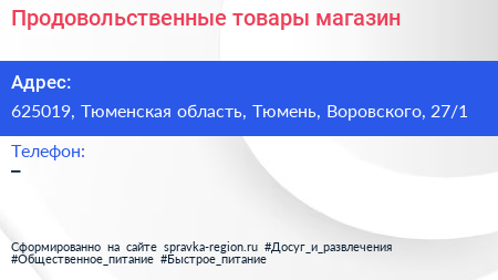 Продовольственные товары, магазин по адресу 625019, Тюменская область, Тюмень, Воровского, 27/1 в дальнейшем Организация, размещена в следующих категориях: