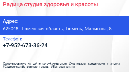 Радица, студия здоровья и красоты по адресу 625048, Тюменская область, Тюмень, Малыгина, 8 в дальнейшем Организация, размещена в следующих категориях: