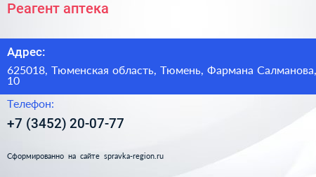 Реагент, аптека по адресу 625018, Тюменская область, Тюмень, Фармана Салманова, 10 в дальнейшем Организация, размещена в следующих категориях: